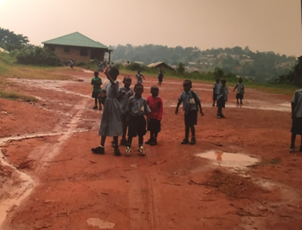The students are all in blue uniforms (boys in pants and collared shirts, girls in dresses) playing happily on a large flat area. The only thing on the yard (besides well dressed children standing on red mud) is a single ball. Yet, everyone seems happy and well amused.